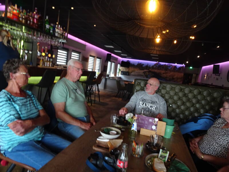 Nadat iedereen zelf heeft ontbeten gaan we om 10 uur beginnen met de fietstocht. We zitten in een supermooie omgeving en vanuit Wapse fietsen we door de bossen naar Diever. We hebben geluk vandaag want het is nu droog. Hopelijk blijft het geluk met ons. In Diever drinken we op het terras een lekker bakje koffie met een heerlijke aardbeipunt erbij. Alleen Rex heeft een chocoladegebakje. Nadat we hebben afgerekend begeven we ons naar het naastgelegen Oer museum. Joop blijft buiten met Sascha, want honden mogen niet naar binnen. Wij bekijken alle informatie en staan na een klein uurtje weer buiten. We hebben veel gezien en gelezen over Drenthe in de oertijd. Daarna pakken we de fiets en fietsen weer verder. Na ongeveer een half uur komen we bij ons lunchadres. Hier zitten we binnen en het is er gezellig druk. Nadat iedereen uitgegeten is fietsen we weer verder door het mooie landschap. Even later stoppen we bij een mooi plekje waar bijzondere runderen in het water staan. We maken wat foto's en zien even verderop ook nog 2 ooievaars. Daarna maken we nog een mooie ronde en genieten van de heidevelden. Het waait behoorlijk, maar het blijft nog steeds droog. We komen weer langs het onderduikhol en de meesten nemen binnen even een kijkje. Wij blijven even buiten, want weer zijn honden verboden. Vanaf daar is het nog maar een klein stukje naar de camping. Wij brengen nog even een bezoekje aan 2 caches en komen iets later op de camping terug. Joop en Marie zijn dan al druk in de weer om alles droog binnen te krijgen. We drinken nog een kopje thee of koffie met boterkoek bij ons voor de camper. Tegen 6 uur lopen we naar het restaurant vooraan de weg van de camping, waar we heerlijk eten. Nadat we weer terug zijn gelopen gaat iedereen naar zijn eigen camper of caravan.