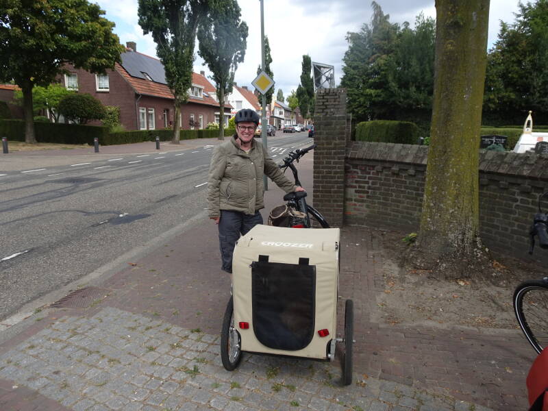 Vandaag gaan we wandelen naar de Bedafse Bergen. We drinken eerst koffie en lopen dan richting Bedaf en dan rechtsaf. Na restaurant de Pier lopen we de bossen in. De Bedafse Bergen is een grote zandverstuiving bij Bedaf. Het is dit weekend gelukkig niet meer zo warm als de dagen hiervoor. We genieten van de aangename temperatuur. Op de terugweg eten we pannenkoeken bij "de Pier". Die smaken echt heerlijk. Als we weer terug zijn op de camping gaan Joop en Marie alvast een heleboel inpakken voor hun reis naar de Moezel. Wij pakken de fiets en fietsen richting Uden en dan door de bossen terug. We hebben 10 km gefietst als we weer terug zijn. Daarna drinken we koffie en thee en om kwart over 5 lopen we naar restaurant Duco even verderop. Wij eten daar op het terras. Het weer is super lekker en Sascha mag niet naar binnen. Weer eten we ijs na bij de camper.