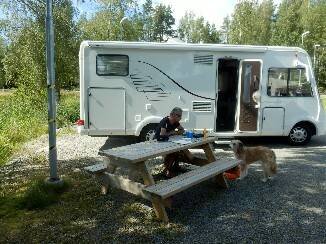 Het is een mooie zonnige dag vandaag. Onze eerste stop vandaag is langs de snelweg, waar we kunnen lozen. Daarna gaan we verder naar Varobacka, een mooi plaatsje aan zee. Alleen mag je hier dus waarschijnlijk niet overnachten. Er staat een bord met een doorgekruist tentje. dus nadat we boodschappen hebben gedaan op de fiets rijden we weer verder landinwaarts. Op de camperplaatsen bij Göteborg wordt er ‘s nachts veel ongebroken en daar hebben we geen behoefte aan. Als we in Skårs Gård in Fjarås op de camperplaats staan horen van Zwitsers dat de campings in Göteborg allemaal vol zijn. Het is maar goed dat we dus niet verder naar het noorden zijn gereden. Voor bij het restaurant en café op het terras wordt een karaokeavond gehouden. Alle mensen van de andere drie campers, die er nog bij zijn gekomen, een Fransman, Zwitsers en een Noor eten op het terras. Wij hebben ons eten al op en zitten nog buiten tot het te koud wordt. De Zwitsers zijn met z’n vieren en vertellen dat ze met de boot van Rostock naar Trelleborg zijn gekomen. Nu zijn ze onderweg naar Oslo, om zo via Noorwegen en Denemarken weer terug te gaan. Ook willen ze via Nederland, omdat hun zoon graag de haven van Rotterdam wil zien. Een hele trip voor de 4 weken, die ze hebben.