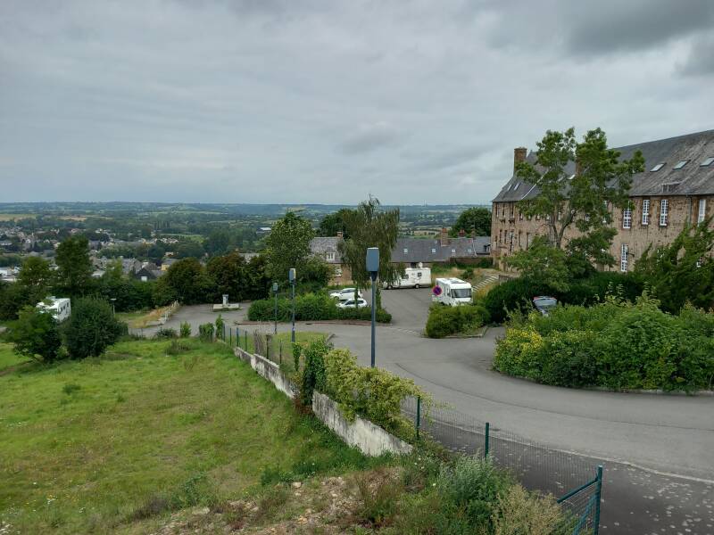 Vandaag rijden we weer verder naar Avranches. De camperplaats ligt erg scheef, want dit stadje ligt op een berg. Vanuit de aangrenzende botanische tuin heb je mooi uitzicht op onder andere Mont St. Michel. We lopen na de lunch de stad in en komen eerst bij de Notre Dame des Champs en bij de rotonde met de tank en de gedenksteen van generaal Patton begint het ineens hard te regenen. We steken vlug elk een parapluutje op en rennen van de rotonde af en vinden een plekje waar we kunnen schuilen. Als het weer droog is, lopen we door het centrum naar het kasteel en vinden daarna nog de laatste 2 caches. Dan lopen we weer terug naar de camper en drinken koffie.
