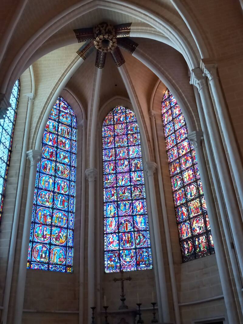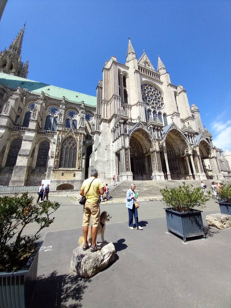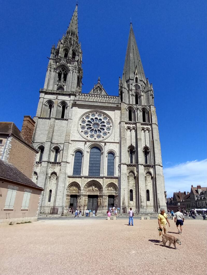 Vandaag op tijd opgestaan en door naar Chartres. Vanmorgen was het net als gisteren nog bewolkt en leek het niet zo warm te worden, maar toen we de fietsen klaar hadden staan kwam de zon er al bijna bij. We hebben dan ook geen jasjes meegenomen. We fietsen via een mooi fietspad langs de Eure naar het centrum van Chartres. We bekijken de mooie kathedraal "de Notre Dame van Chartres ". Zowel buiten als binnen heeft deze heel veel beelden en Deze kathedraal is een vroeg-Gotische kathedraal die tot de beroemdste van Frankrijk behoort. De kathedraal staat op een heuvel met uitzicht over de stad en werd gebouwd tussen 1194 en circa 1220. De kathedraal dankt haar faam vooral aan haar gebrandschilderde ramen, waardoor de gloed van het blauwe Chartreslicht schijnt. (Bron: Wikipedia). Het is echt de moeite waard om deze te bekijken.