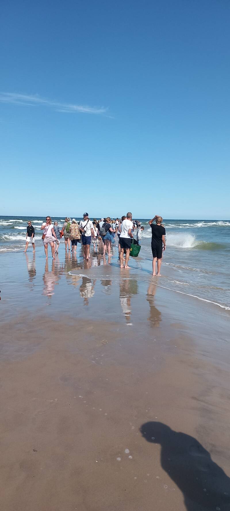We lopen over het fietspad en gaan daarna verdee langs de bunker over het strand naar het uiterste puntje, waar het Kattegat en het Skagerak met elkaar botsen. Het is behoorlijk druk op het strand, maar we kunnen toch wel wat foto's en filmpjes maken van dit fenomeen.