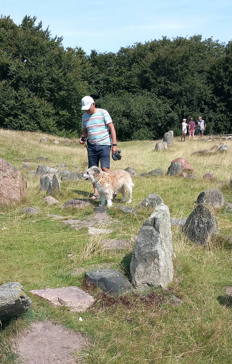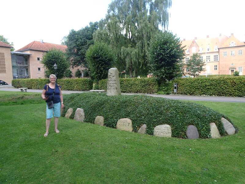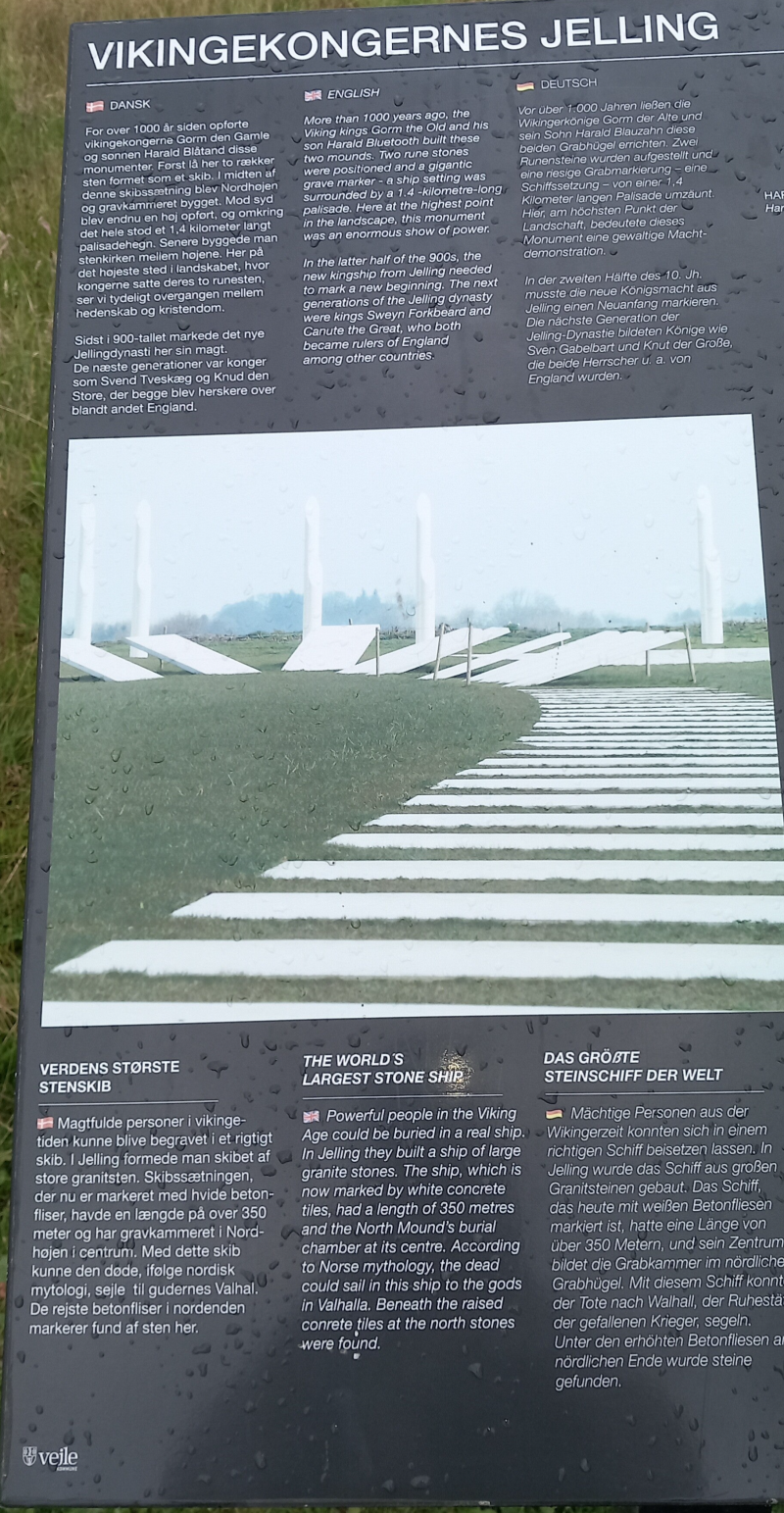 In Jelling parkeren we op de voor campers beschikbare parkeerplaats, drinken eerst koffie en lopen daarna naar het museum. Honden zijn niet toegestaan, dus we beperken ons maar weer tot alles wat buiten te zien is. Op dez plaats heeft een Vikingdorp gestaan. Het was zelfs de plaats waar de vikingkoningen hebben gewoond. Vikingkoning Harald Blauwtand richtte in het jaar 965 zijn grote runensteen in Jelling op, ter nagedachtenis aan zijn ouders Gorm de oude en koningin Thyra. Hiermee vestigde hij zijn naam ook als de koning die de Denen tot het christendom bekeerde. Onder de kerk bevindt zich het graf van Gorm. Er zijn 2 heuvels, de Zuidheuvel voor de kerk en de Noordheuvel achter de kerk. In de Noordheuvel is een grafkamer aanwezig. Vanaf de heuvels heb je mooi uitzicht. Onze internetverbinding van de telefoon valt elke keer weg, zodat we de vragen van de labcaches niet goed kunnen beantwoorden.