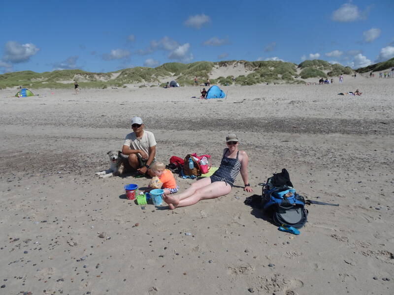 Vandaag gaan we verder naar Nymindegab, waar Gea en Hendrik met de kinderen op de camping staan. We zijn er al om half 10, want het is maar 30 km verderop. We gaan vlakbij hun staan en drinken eerst koffie. Om half 12 gaan we lunchen, zodat we lopend naar het strand kunnen. De kinderen gaan op de fiets, behalve Jinte. Voor haar heeft Hendrik zijn rugdrager mee, zodat ze daar in kan als ze moe is. Het is 1,8 km lopen en het laatste stuk moeten we door het rulle zand van de duinen. Aan het strand gaat Hendrik gelijk het water in en zwemt door de golven. Ook de kinderen en Gea gaan het water in, maar ik vind het koud als ik met mijn voeten erin sta. Samen met Rex, Sascha en Jinte zitten we in het zand. Jinte zit naar hartelust te graven met haar schepje. Iedereen vermaakt zich prima. Op dit strand liggen geen schelpen, maar alleen stenen op het zand. Als iedereen uitgezwommen is lopen we weer terug naar de camping. Hendrik gaat samen met Rex boodschappen doen voor het avondeten. Als zij weer terug zijn gaan Gea en ik met de kinderen zwemmen in het zwembad. Tegen 6 uur gaan we terug en zorgen we ervoor dat we eten krijgen. Na het eten zijn de kinderen aardig moe.