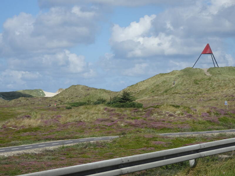 Vandaag weer verder naar het noordelijkste puntje van Denemarken, Skagen. Eerst rijden we naar een caravanzaak, want het pompje van ons water is stuk. Gelukkig hadden ze een nieuwe en nadat Rex hem heeft vervangen, kunnen we onze wc ook weer fatsoenlijk doorspoelen. Daarna rijden we eerst over een stukje snelweg richting Hjorring, maar dan verlaten we de snelweg bij afslag 5 en rijden binnendoor via Tars, Sindal naar Versted en dan over weg 597 weer verder naar weg 40, die naar Skagen leidt. In Skagen is het superdruk. Parkeren doen we na de plaats en dan lopen we naar de Vippefyret, dit lijkt op een katapult, maar het is een replica van een vuurtoren uit 1627. Er werd een emmer met brandende kolen opgeheven en deze diende dan als baken voor de langs varende schepen.