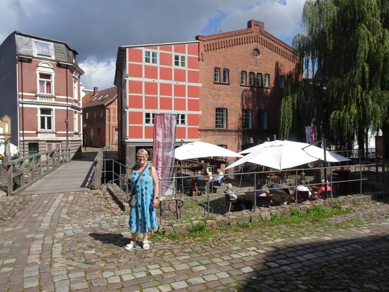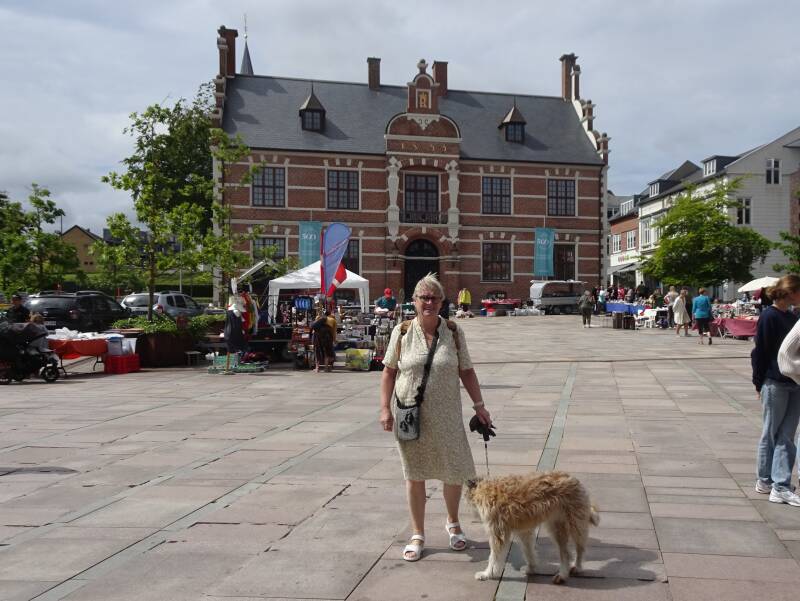 Vandaag staat er een harde wind. We rijden door naar Ribe, waar we eerst water vullen. Nu is er nog plek en ik ga alvast de stoel op een lege plek zitten. Dat is ook nodig, want binnen no time staat alles weer vol. We drinken dan eerst koffie. Ook de lunch nuttigen we voordat we het mooie oude stadje inlopen.