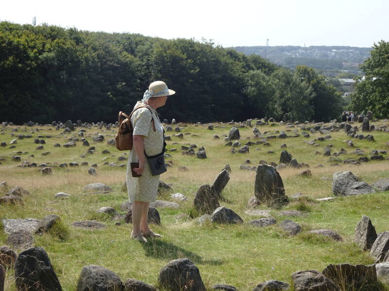Vandaag verder naar Ålborg naar het Vikingmuseum. Onderweg staat er ineens een hert op de weg. Terwijl wij afremmen, spurt het weg door de wielrenners op het fietspad. Helaas dus geen foto kunnen maken. Het Vikingmuseum is naast de begraafplaats op Lindholm Høje. Dit is een van de mooiste en belangrijkste historische monumenten van Denemarken uit de late ijzertijd en de Vikingtijd. Er zijn in totaal 41 grafkuilen en wel 700 crematiekuilen gevonden, die zich uitstrekken van ongeveer 400 na Christus tot ongeveer 1000 na Christus.