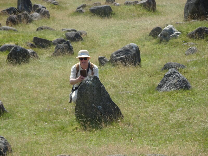 Omdat het gaat regenen gaan we weer terug naar de camper. We lunchen en ondertussen regent het best hard. Voor 2 uur is het bijna droog. Ik ga dan alleen op stap om te kijken of ik de vragen alsnog kan beantwoorden. Ik loop vervolgens de hele ronde, zie waar de huizen van de Vikingen hebben gestaan en ik zie het schip, waar de doden in het Walhalla van de Goden werden gebracht. Als ik terug kom bij de camper hoef ik nog maar een vraag te beantwoorden. Die kunnen we later doen als we langs de winkel gaan. Ik ben net op tijd terug, want weer begint het te regenen en ook is er dit keer onweer bij.