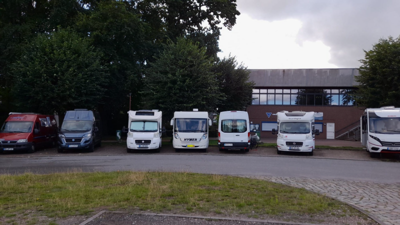 Vandaag gaat het de hele dag regenen. We besluiten om 220 km verder te gaan, zodat we net voor Hamburg de camperplaats in Bad Oldesloe kunnen nemen. In Jels maken we eerst ons Deense geld nog op bij de Netto. Onderweg regent het bijna de hele tijd en er staat een flinke wind met windstoten van 70 - 100 km per uur. Het eerste stuk is binnendoor tot we bij de snelweg komen. We staan hele stukken in de file en doen er dus bijna 5 uur over. Als we aankomen schijnt de zon en kunnen we nog net op een smal plekje tussen 2 andere campers op de camperplaats staan. We merken dat we weer een stuk zuidelijker zitten, want om 10 uur is het allang donker.