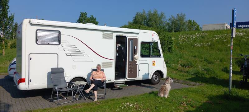 We rijden nadat Rex thuis komt van zijn werk weg. Bij Den Bosch komen we in de file en nemen we de afslag naar Kerkdriel. Bij Rossum komen we op een smal stuk land tussen Maas en Waal. Daarna komen we via Heerewaarden in Dreumel, waar we aan de Waaldijk moeten zijn. Het laatste stuk is dan ook behoorlijk smal, maar al snel zijn we bij camping "De Rijskamp". Het is al half 5 geweest en na de thee zorg ik voor het eten. Vandaag en het hele weekend wordt supermooi qua weer, rond de 24 graden.