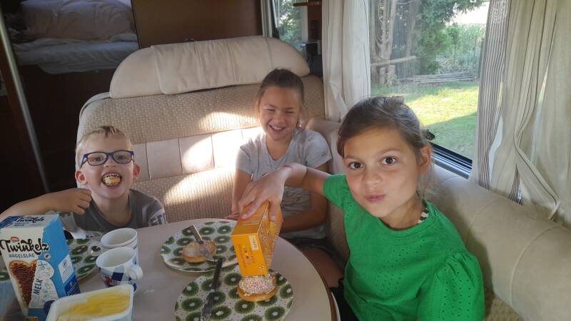 Als we weer bij de camper zijn drinken we koffie en daarna fietst Rex samen met Feline nog naar de Jumbo in Dreumel om extra broodjes te halen. Harro en Merlijn komen op de racefiets om de meiden te halen en dan kunnen ze bij ons lunchen. Tobias rijdt voor het eerst mee in de camper naar Tiel en zit als een prins in zijn stoel te genieten. Nadat we hem thuis hebben afgeleverd plukken we nog appels in Tiel en rijden vervolgens naar huis.