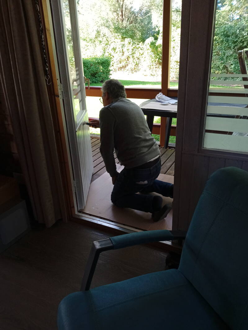Hard aan het werk om het huisje nog mooier te maken. Boven ons luxe wastafelmeubel een grote spiegel met led-verlichting erin opgehangen. Verder zijn we begonnen om de binnen kozijnen en de deuren wit te schilderen, zodat het lichter in huis wordt en de ruimte groter lijkt.