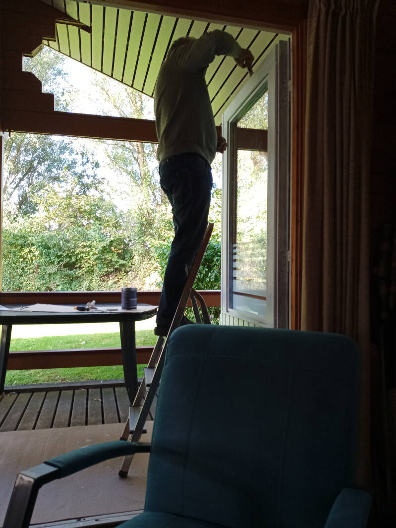 De slaapkamer ramen en de voordeur schuren en in de grondverf te zetten. Dan alles 2 x in de lak. De kamer ziet er mooi groot uit met zulke lichte deuren. Verder alvast begonnen met de tochtstrips aan te brengen.