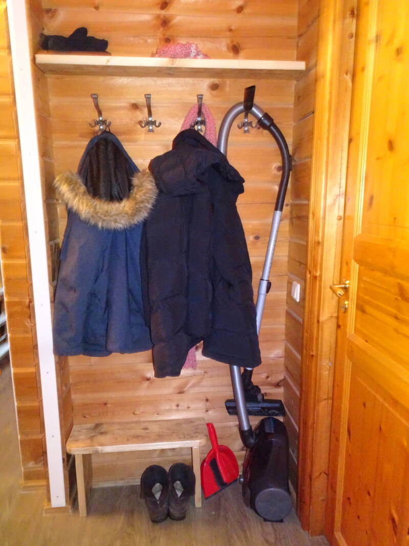 Plank boven de kapstok voor de mutsen en handschoenen, bankje eronder om je schoenen onder te zetten en nog iets op te leggen,